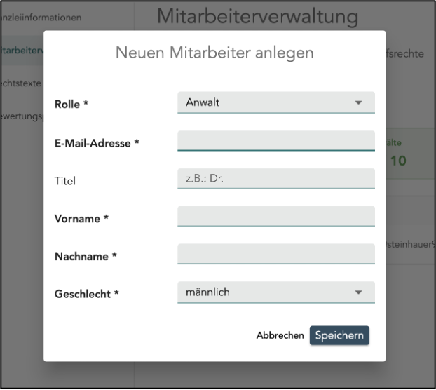 - Wählen Sie die Rolle des Mitarbeiters (z. B. Anwalt).