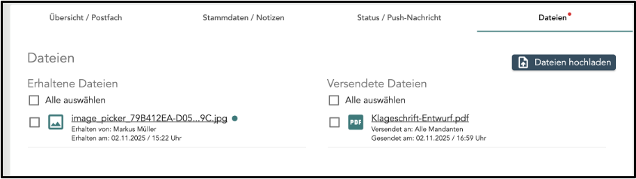 Der Reiter „Dateien“ ist Ihr zentrales Archiv für alle Dokumente, die in dieser Akte ausgetauscht wurden. Die Ansicht ist übersichtlich in zwei Spalten aufgeteilt: