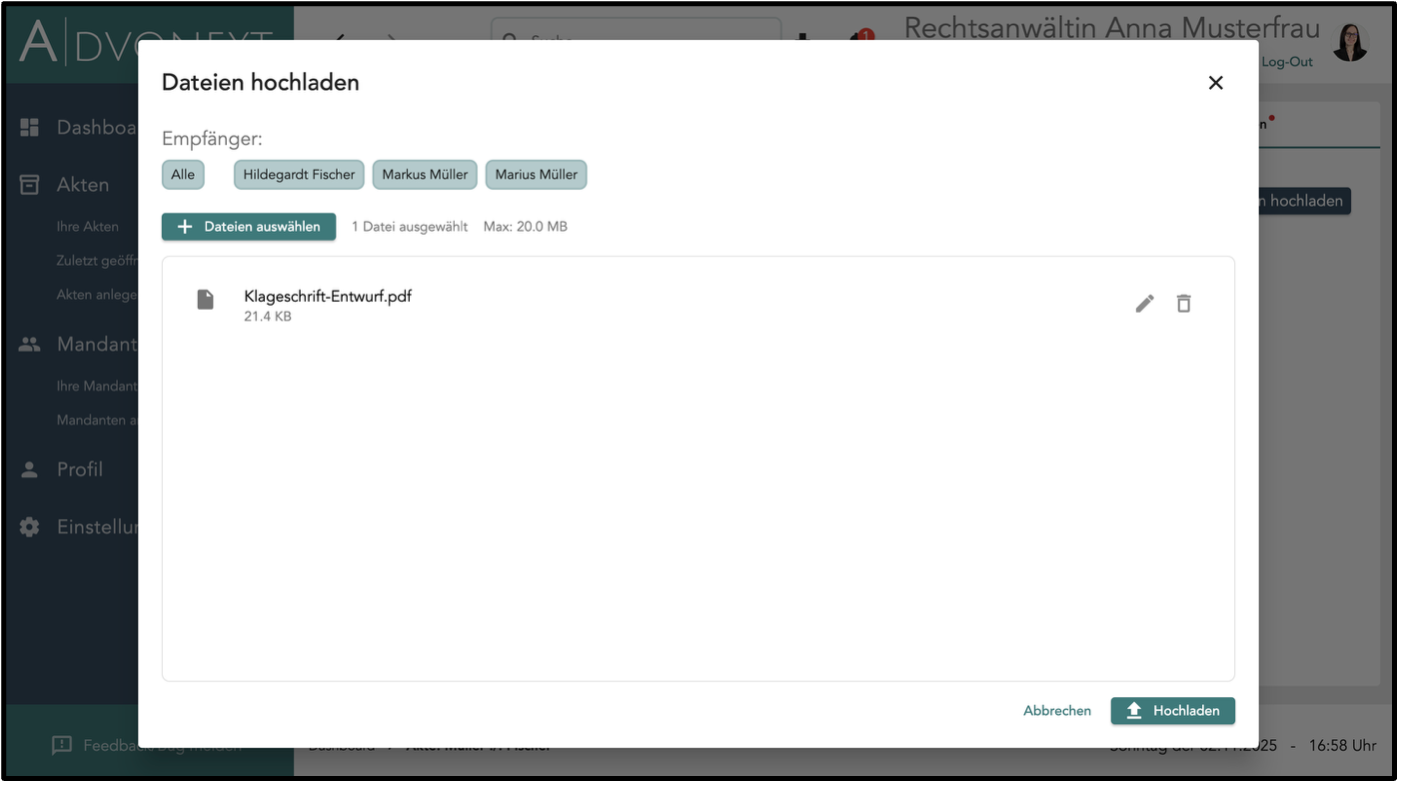 - Empfänger auswählen: Sie können auswählen, welcher Mandant (oder ob „Alle“ Mandanten) in dieser Akte die Datei(en) erhalten soll. So können Sie genau steuern, wer was sieht.