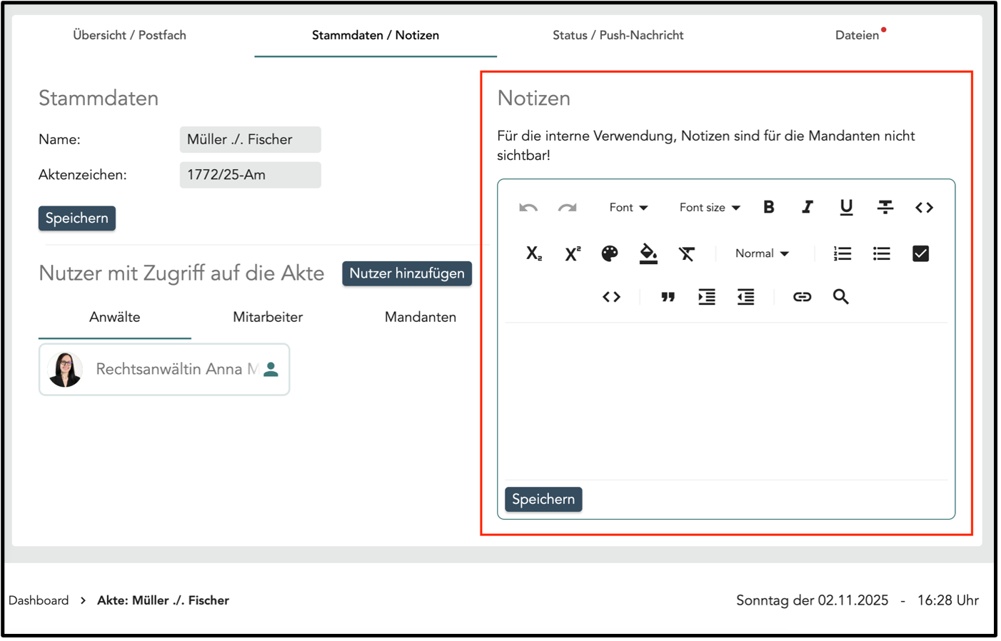 Unter dem Reiter „Stammdaten / Notizen“ können interne Notizen zur jeweiligen Akte hinterlegt werden. Diese Notizen sind ausschließlich kanzleiintern sichtbar – der Mandant erhält keinen Zugriff darauf.